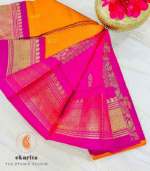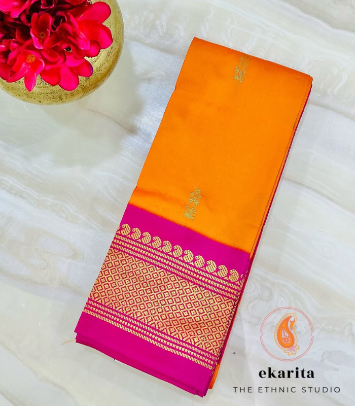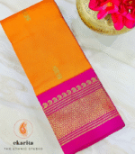 For the moments when only silk will do, this Amrapali saree in vibrant orange and pink hues is crafted from pure mulberry silk. Adorned with detailed zari puttas (butis) and a heavy zari pallu, it is a timeless and festive drape from the Amrapali collection.
