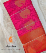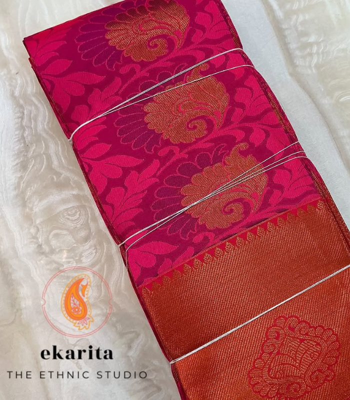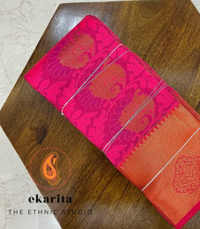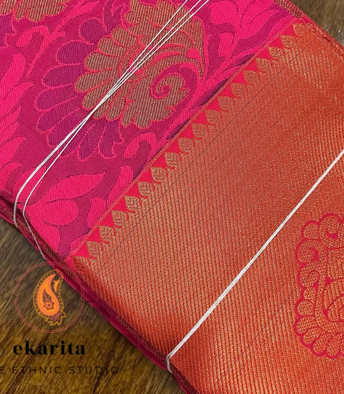 A graceful Champa saree in soft pink Kanchipuram silk, adorned with delicate floral motifs and a golden zari border. Lightweight and easy to drape, with a rich zari pallu, it blends traditional elegance with everyday comfort.